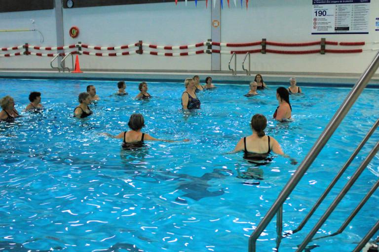Conditionnement physique aquatique offert dans la partie peu profonde de la piscine et adapté pour les personnes de 55 ans et plus (échauffement, exercices aérobiques, exercices musculaires et détente).