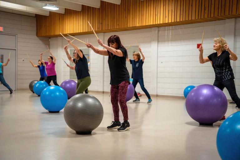 Activité combinant des éléments de cardio, de tonus et de flexibilité, qui se pratique debout ou assis, tout en frappant un ballon avec des baguettes au rythme d’une musique entraînante. L’intensité est adaptée selon votre condition.